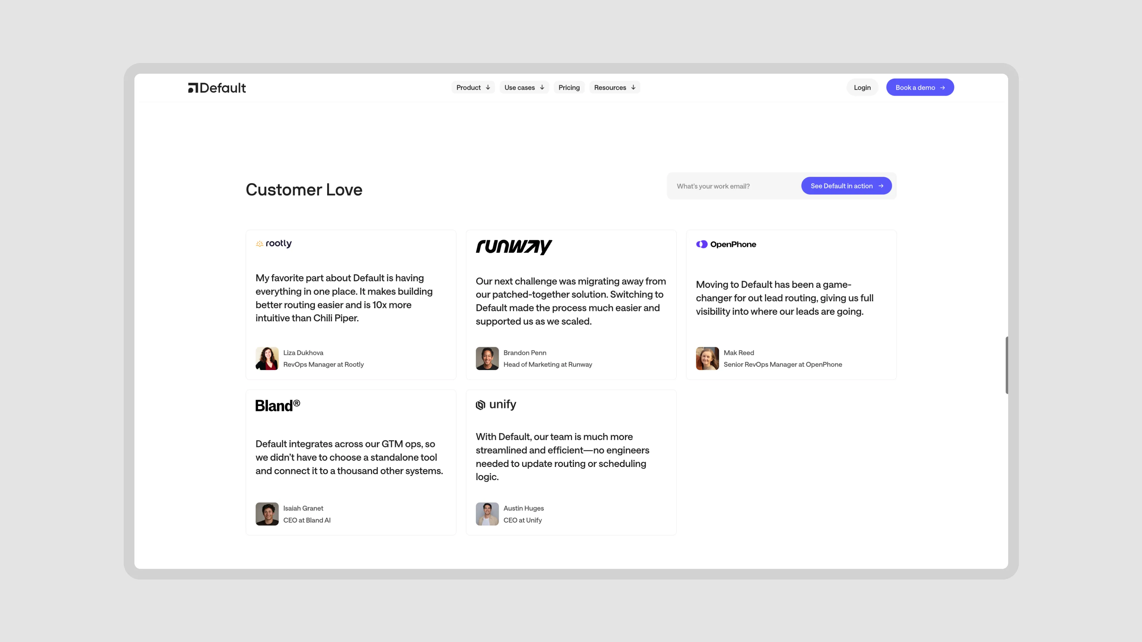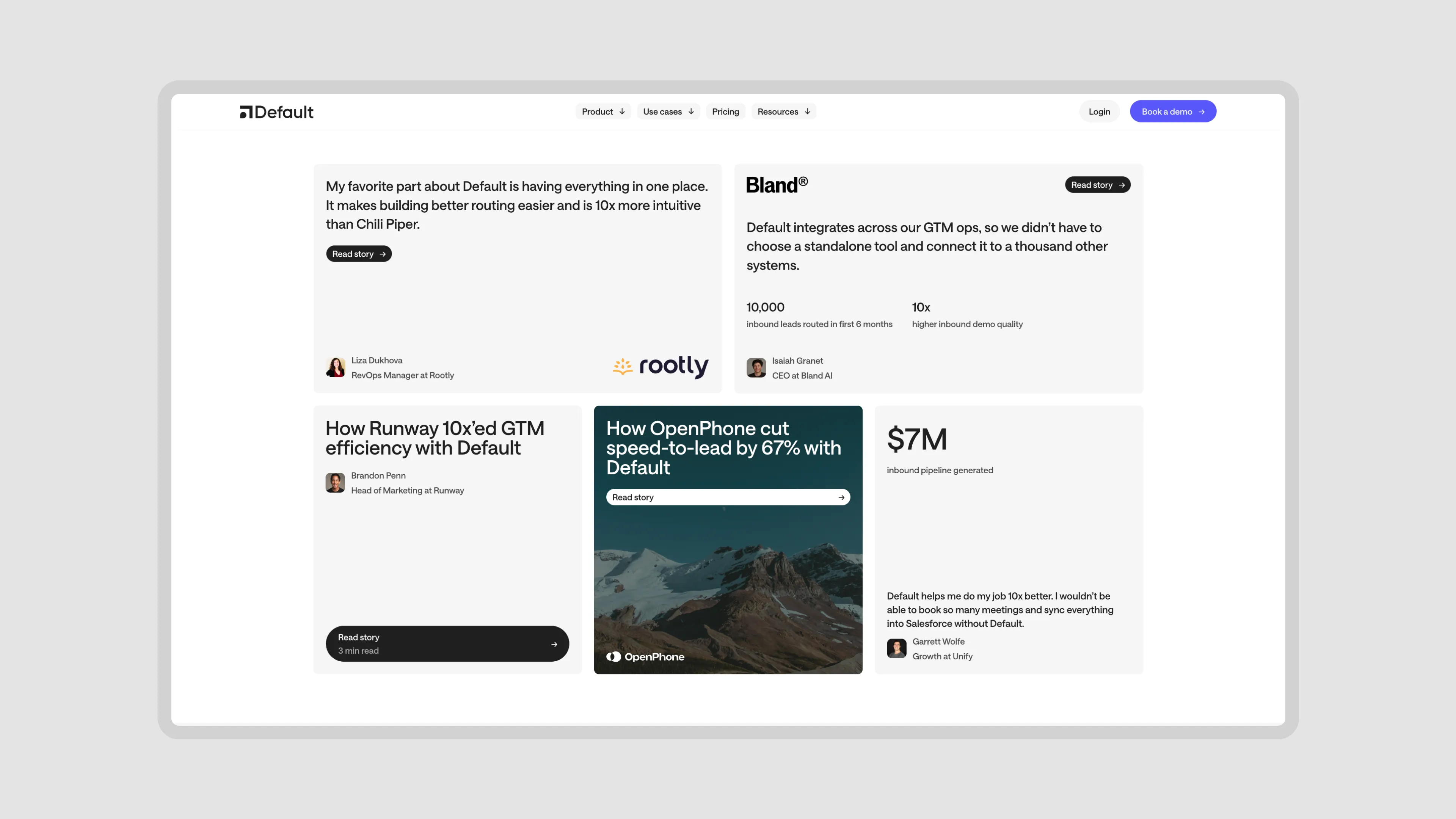 Default is the inbound orchestration platform for revenue teams. Their client list is stacked with some of the fastest growing B2B startips like Amplemarket, Runway, OpenPhone, Bland.